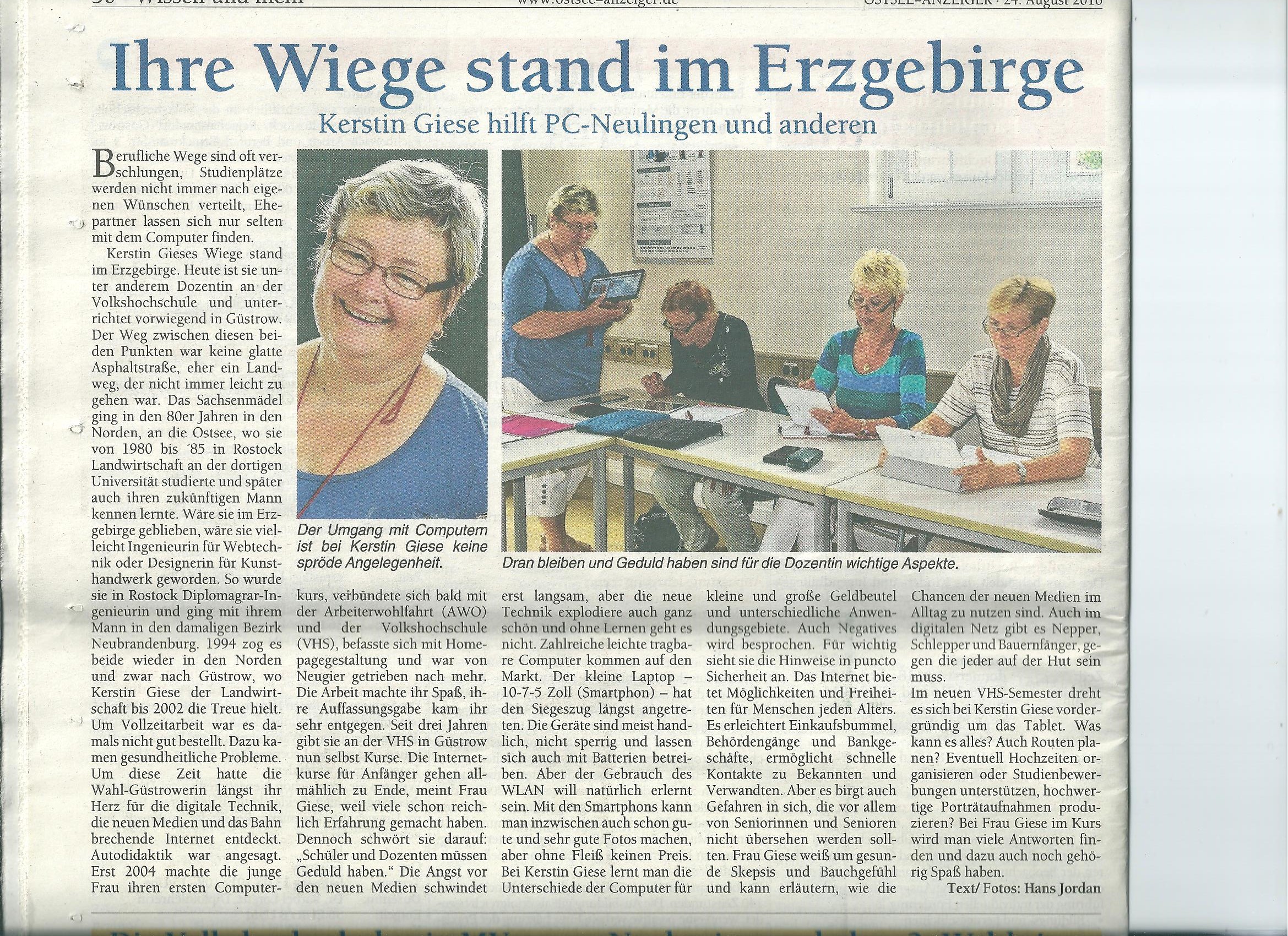 Frau W. aus Marlow (06.06.2016) Werte Frau Giese Der Computer-Kurs mit ihnen ist immer sehr spannend. Wenn ich Probleme habe sind Sie immer da und wir lösen es immer gemeinsam. Wenn ich außer der Zeit Probleme habe, kann man Sie anrufen und sie suchen immer nach Lösungen. Sie verfügen auch über das Wissen, was sie an uns gerne mit viel Freude weiter geben. Der Kurs ist für über 50-Jährige, der ganz toll ist. Ich bin nach Empfehlen von meiner Schwägerin in diesen Kurs gekommen. Ich bin darüber sehr dankbar. Ich kann es nur jedem weiter empfehlen. Ich komme aus den Raum Marlow und nehme die Fahrt gerne auf mich, weil ich den Umgang mit dem Computer lerne. | Ihre Wiege stand im Erzgebirge...Ostseeanzeiger Stadt Bad Doberan und Umgebung Sonderheft Vokshochschule August 2016 | Frau W. aus Güstrow (06.062016) Da ich mit Computer überhaubt nicht auskannte, mir dann einen Laptop zulegte, habe ich mich zum Computerkurs entschieden. Es macht viel spaß (wir sind eine gute Truppe). Wenn Probleme auftreten ist Frau Giese immer bereit zu helfen ob im Unterricht oder zu Hause. Frau H. aus Laage (06.06.2016) Ich finde den Kurs PC für Leute über 50 toll. Besonders weil es nicht hochwissenschaftlich zu geht und jeder Laie viel begreift. Im Notfall reicht ein Anruf und einem wird geholfen. Danke Frau Giese ! H.H. |
